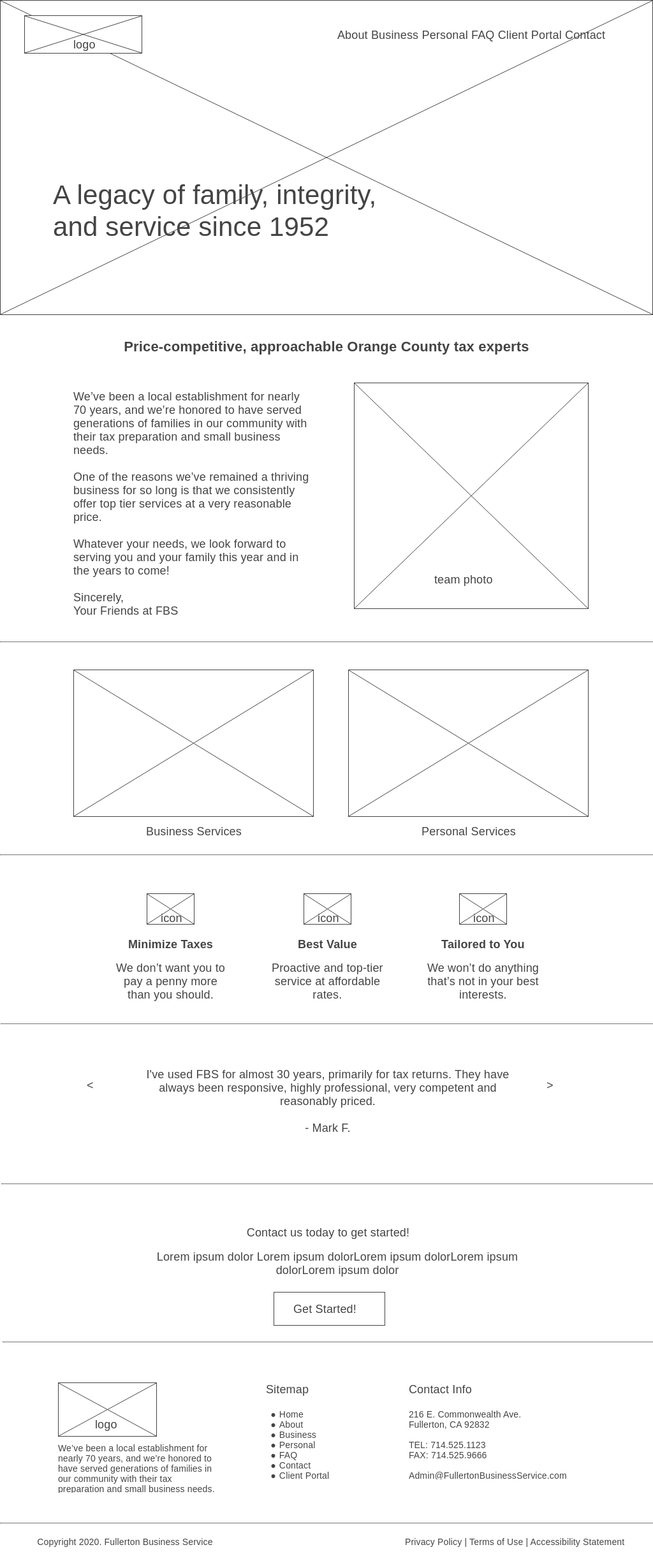 Again, keep in mind that the page will look much prettier when it’s designed. We’ll add lovely images and other nice touches to break up the sections, evoke some emotion, and so forth. The wireframe’s job is to make sure everything’s there that needs to be there, and nothing’s there that shouldn’t be there.